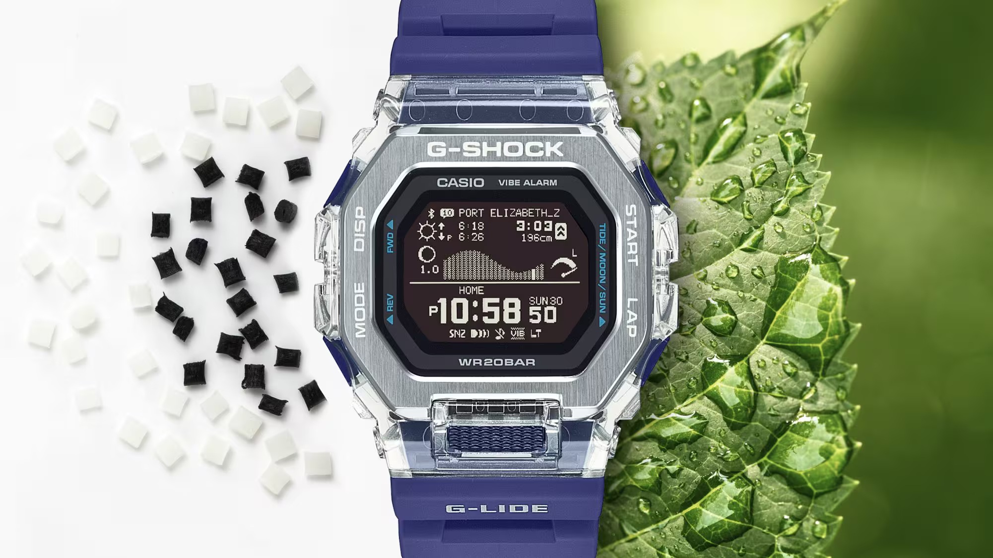Блискучий безель, що нагадує мерехтливі хвилі: годинники G-LIDE з неповторним стилем для літнього серфінгу Присвячена забезпеченню міцності та функціональності, необхідних для способу життя серфера, лінійка G-LIDE тепер пропонує годинники GBX-100S з матеріалами та кольоровими гамами, що випромінюють літній шарм. Натхненний мерехтливими хвилями, що виблискують на сонці, безелі виготовлені з комбінацій блискучих компонентів з нержавіючої сталі та глянцевої напівпрозорої смоли, що втілює момент єдності з мерехтливими хвилями.